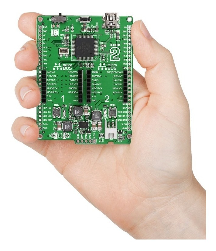 Miles de posibilidades con tableros de clic. Con dos enchufes mikroBUS en el clicker 2, puede aprovechar el enorme potencial de las placas click, la gama en constante expansión de más de 300 placas adicionales. Combine diferentes funcionalidades y cree inventos nuevos y originales. Eso es solo dos clics y su proyecto está a medio camino. Continúe y juegue con algunas ideas de inmediato.